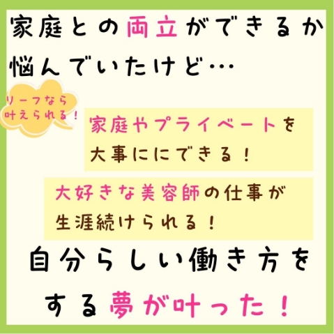 8:50 託児所に、お子様を預ける 9:30 美容室LeaFへ出勤!営業準備 10:00 サロンワーク開始、オープン 17:00 サロンワーク終了 17:40 託児所へお迎えに 18:00 帰宅し、家事を始める♪